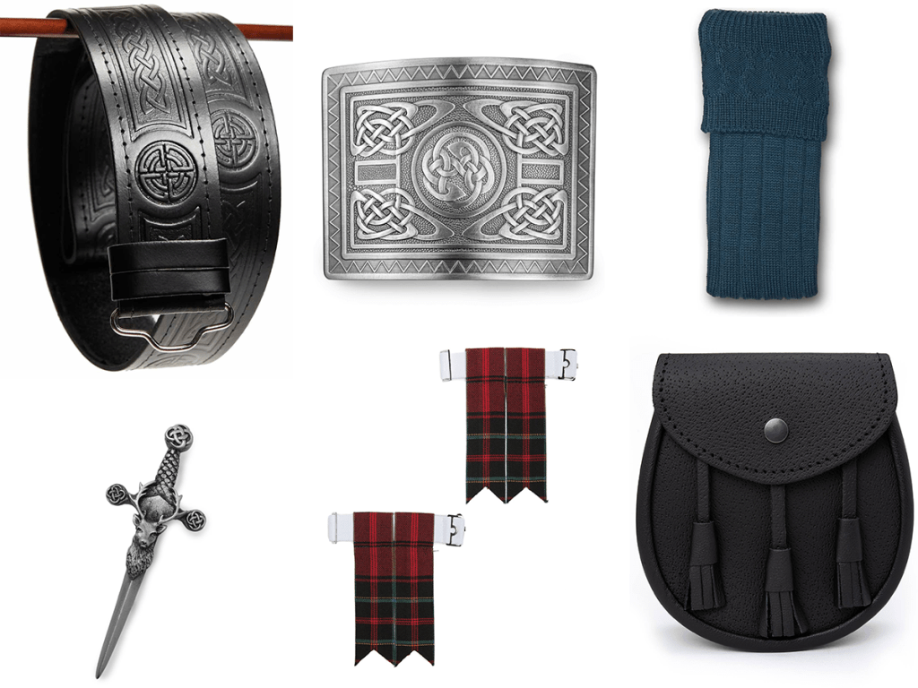 If you want to fully accessorize your kilt, you can opt for this package. It comes with: Hose (Socks) in a grey/blue color, Matching Tartan Flashes, Black Leather Kilt Belt, Kilt Belt Buckle, Kilt Pin and an economy day sporran.